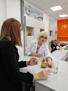 На уроке ребята познакомились с понятием «Химия», узнали, где химия может быть полезна. Гостем урока стала студентка УРФУ Мещерякова Екатерина, которая продемонстрировала ребятам химические опыты «Вулкан», «Змейка», «Гроза». В ходе урока ребята самостоятельно выполнили опыт «Портрет-невидимка» и практически увидели «волшебство» химии.